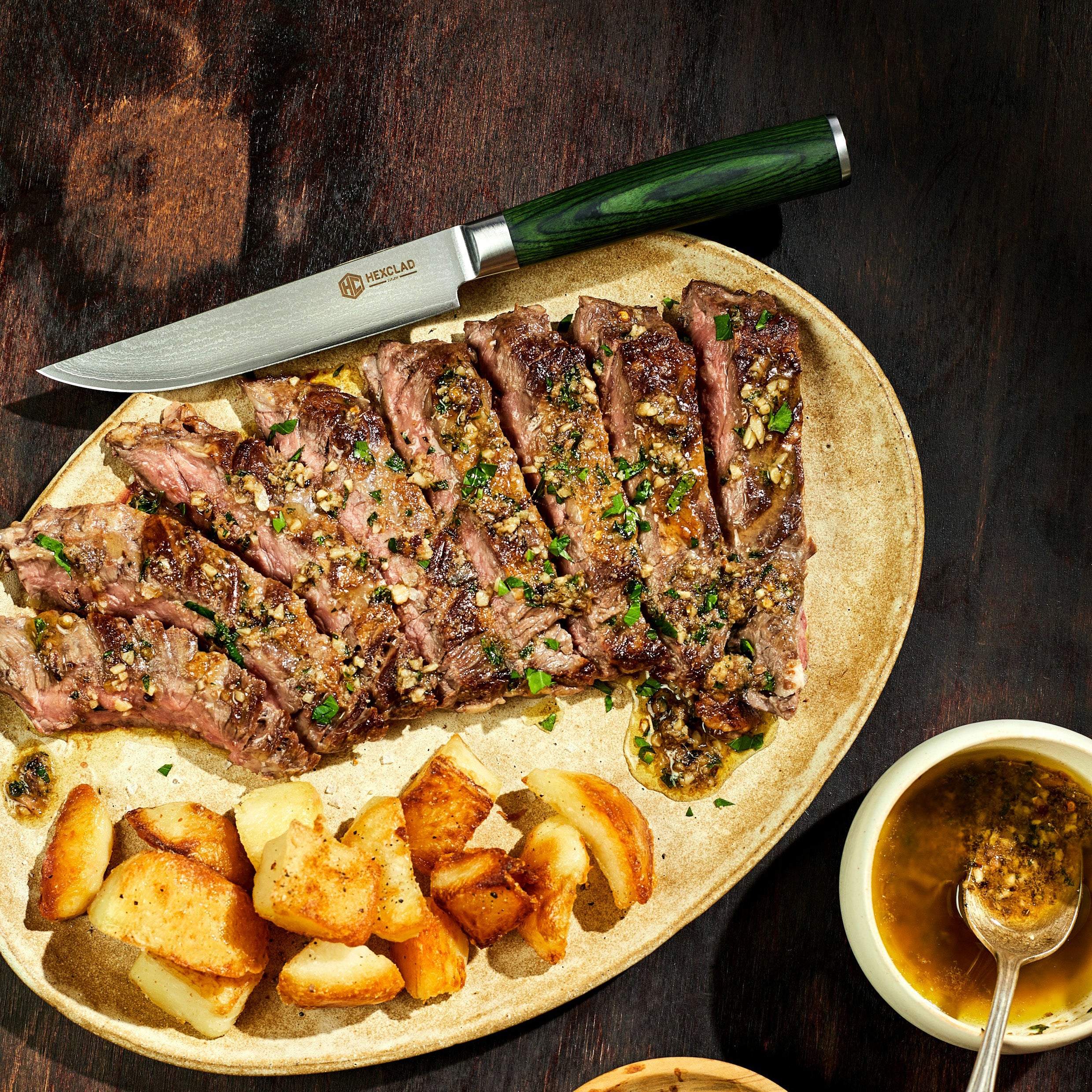 Our 8-piece Japanese Damascus steel steak knife set is for those who want to savor, not saw, their favorite meats. Made to the same exacting standards as our chef’s knife, each blade is forged from 67 layers of Japanese Damascus steel for incredible sharpness that glides through any protein. Featuring a mirror-finished blade and unique forest green Pakkawood handle, they naturally elevate any table setting.