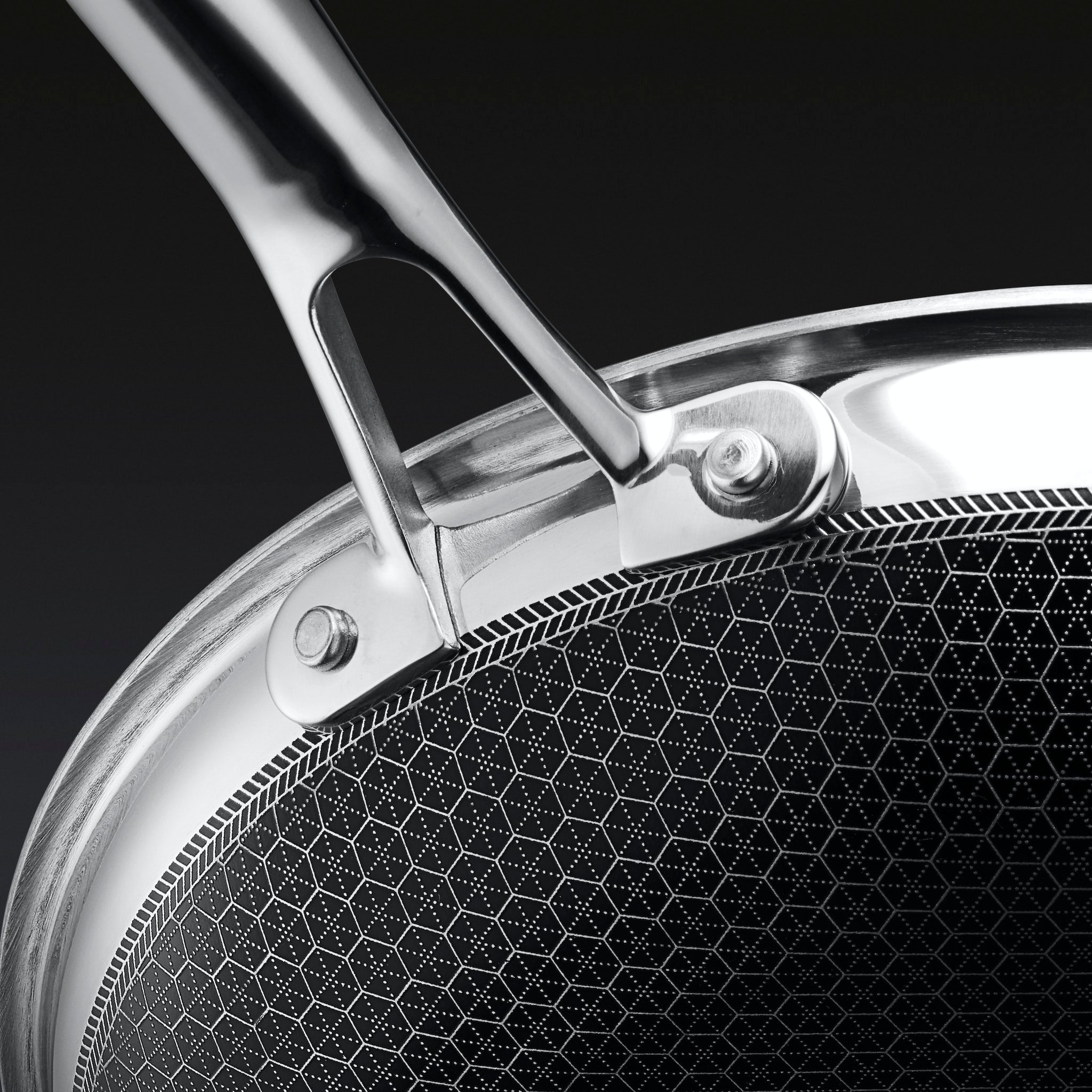 The HexClad 12″ Pan is ideal when you’re cooking for a crowd. When it’s time for a family dinner or a group of friends for brunch, this spacious pan can handle the job. Whip up a frittata or easily cook two steaks at a time. Cook up at least four salmon fillets with room for veggies. There’s no stopping your culinary prowess with a pan that offers so many possibilities. Tempered glass vented lid allows for easy monitoring.
